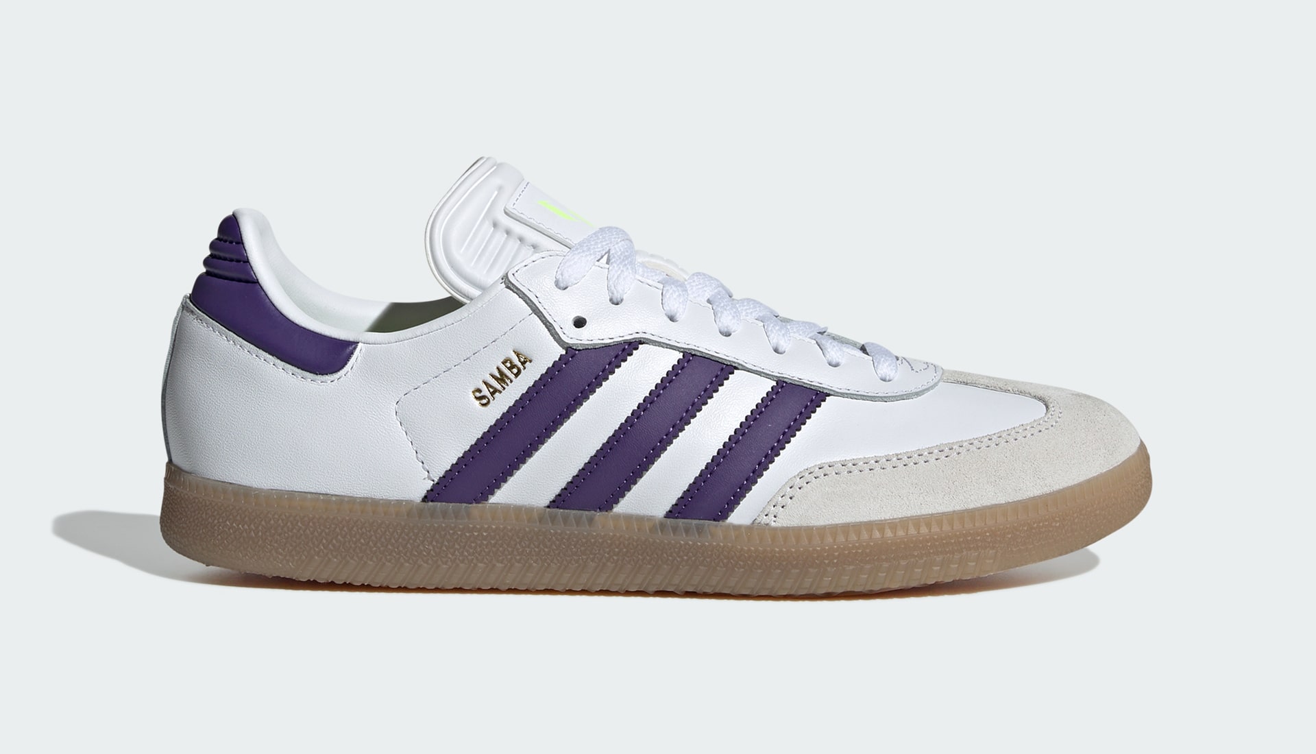 the first pair is a simple affair, combining a white leather base and grey suede overlays with a gum sole and purple on the Three Stripes and heel. The typical “SAMBA” text is present, with Messi’s logo appearing in neon green on the tongue.