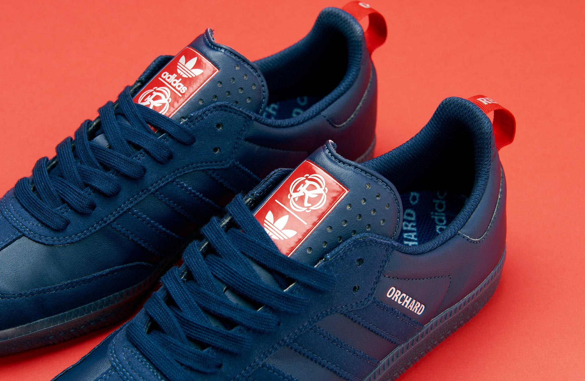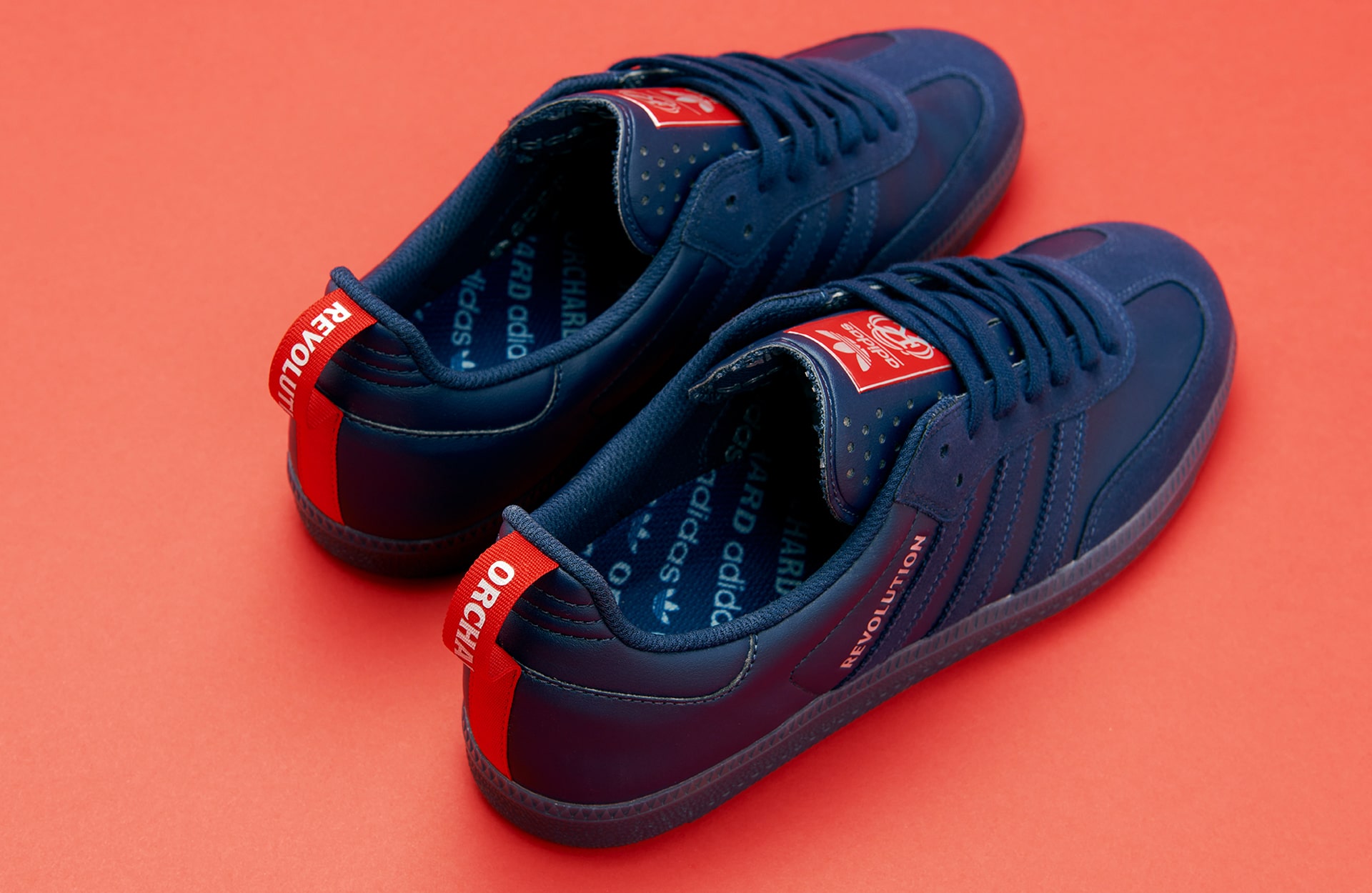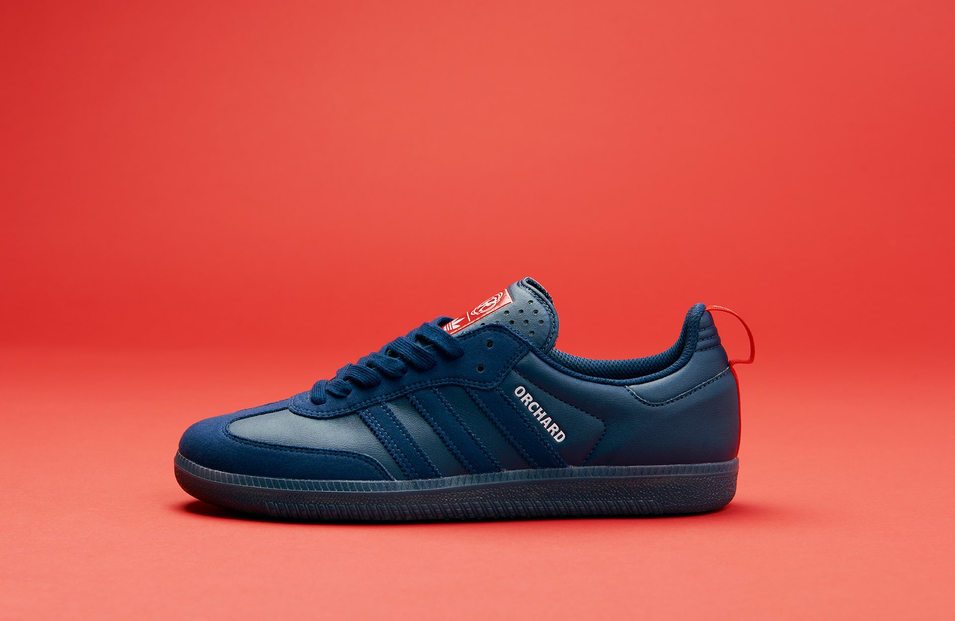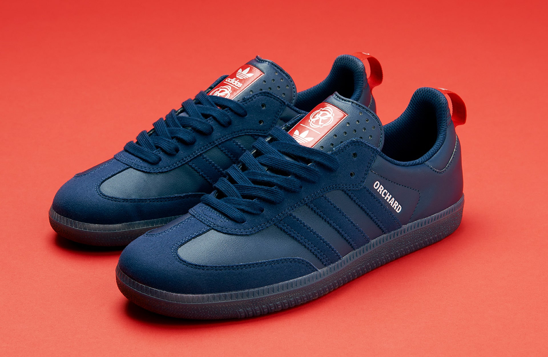 For the collection’s footwear, Orchard naturally opted for the Samba ADV—a heritage classic with roots in soccer. The Orchard x New England Revolution Samba ADV arrives in an indigo and red colourway, with Orchard’s name inscribed atop the serrated Three Stripes and New England Revolution’s logo appearing alongside the adidas Trefoil on the tongue. Built from synthetic leather and suede, the silhouette is equipped with ADV skate performance features to handle the board’s demands.