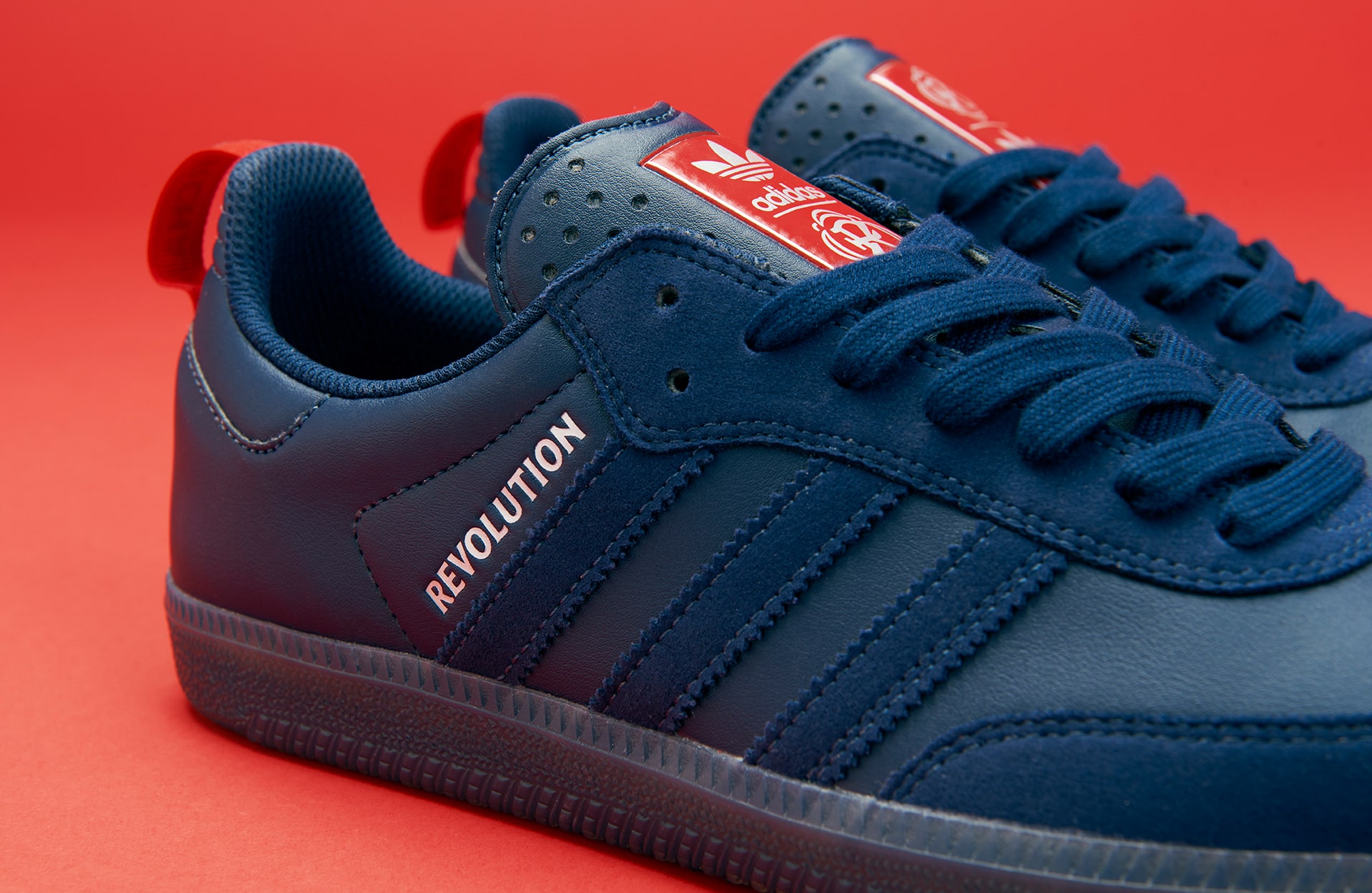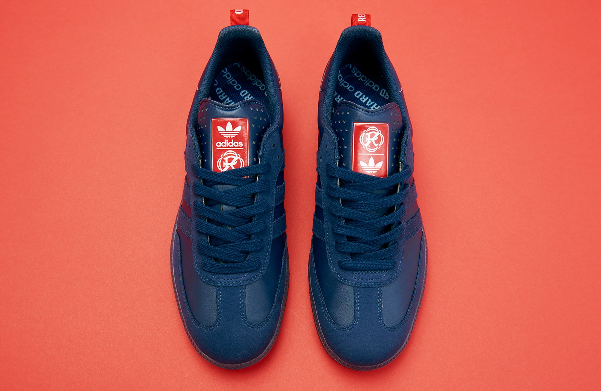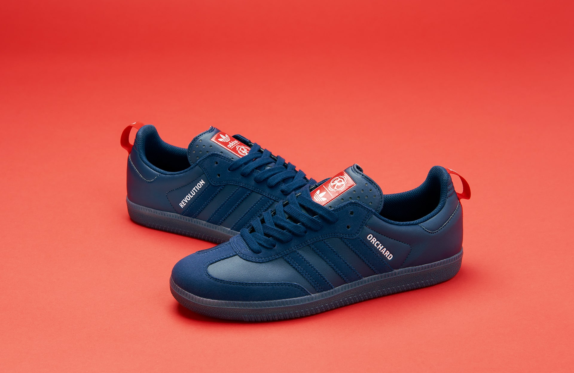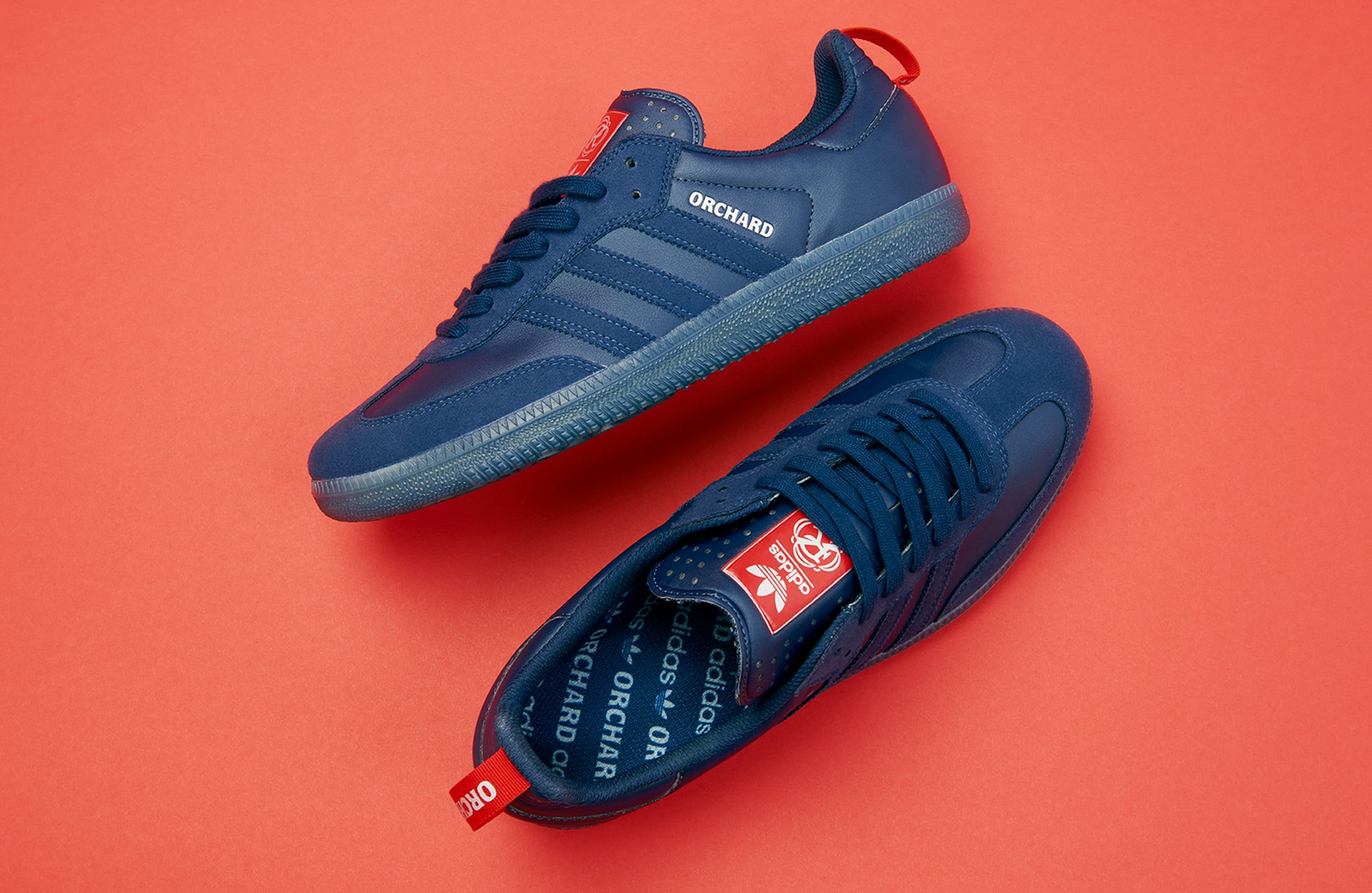For the collection’s footwear, Orchard naturally opted for the Samba ADV—a heritage classic with roots in soccer. The Orchard x New England Revolution Samba ADV arrives in an indigo and red colourway, with Orchard’s name inscribed atop the serrated Three Stripes and New England Revolution’s logo appearing alongside the adidas Trefoil on the tongue. Built from synthetic leather and suede, the silhouette is equipped with ADV skate performance features to handle the board’s demands.