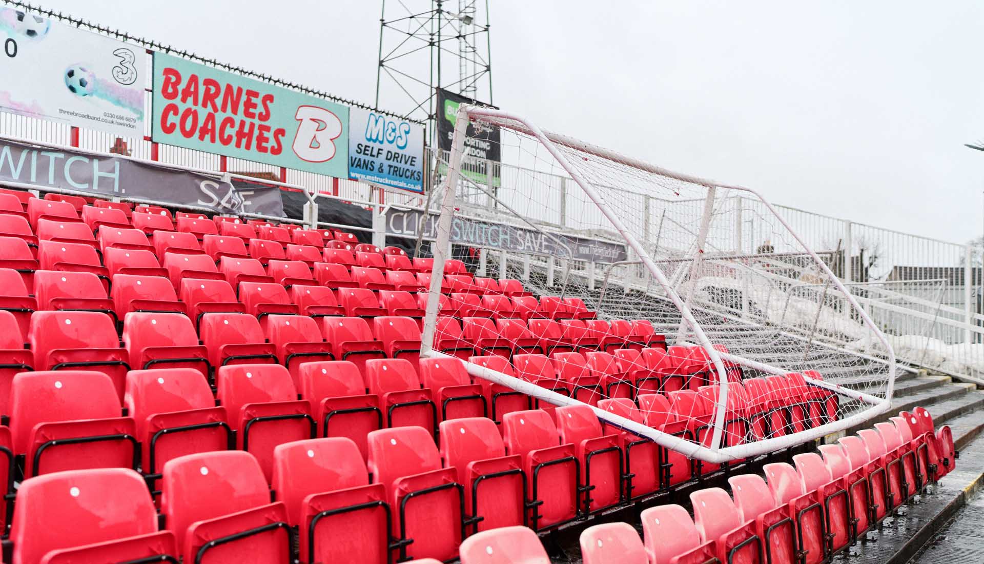 The Town End behind the goal is where Swindon's most vocal supporters congregate. One of the floodlights in this stand pierces the roof.