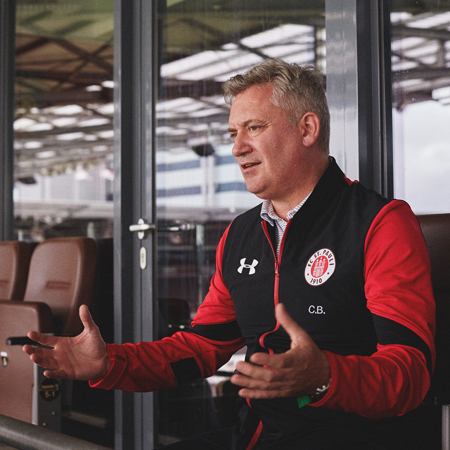 Many moments have crystallised the shared love of music between Irvine and his club. Before he walks out onto the midfield for every game, Hells Bells by AC/DC floods the stadium. “The Millerntor is rocking, the Jolly Roger flags are waving in the stands and those big power chords run right up your spine. An Aussie pub rock song on the football field, it’s perfect for me,” describes Irvine. He scored his first goal against Hansa Rostock in October 2021 to the sound of another one of his favourites, Song 2 by Blur. “I remember punching the air and soaking it all in while the fans chanted along. I don’t think there could have been a better time to score.”