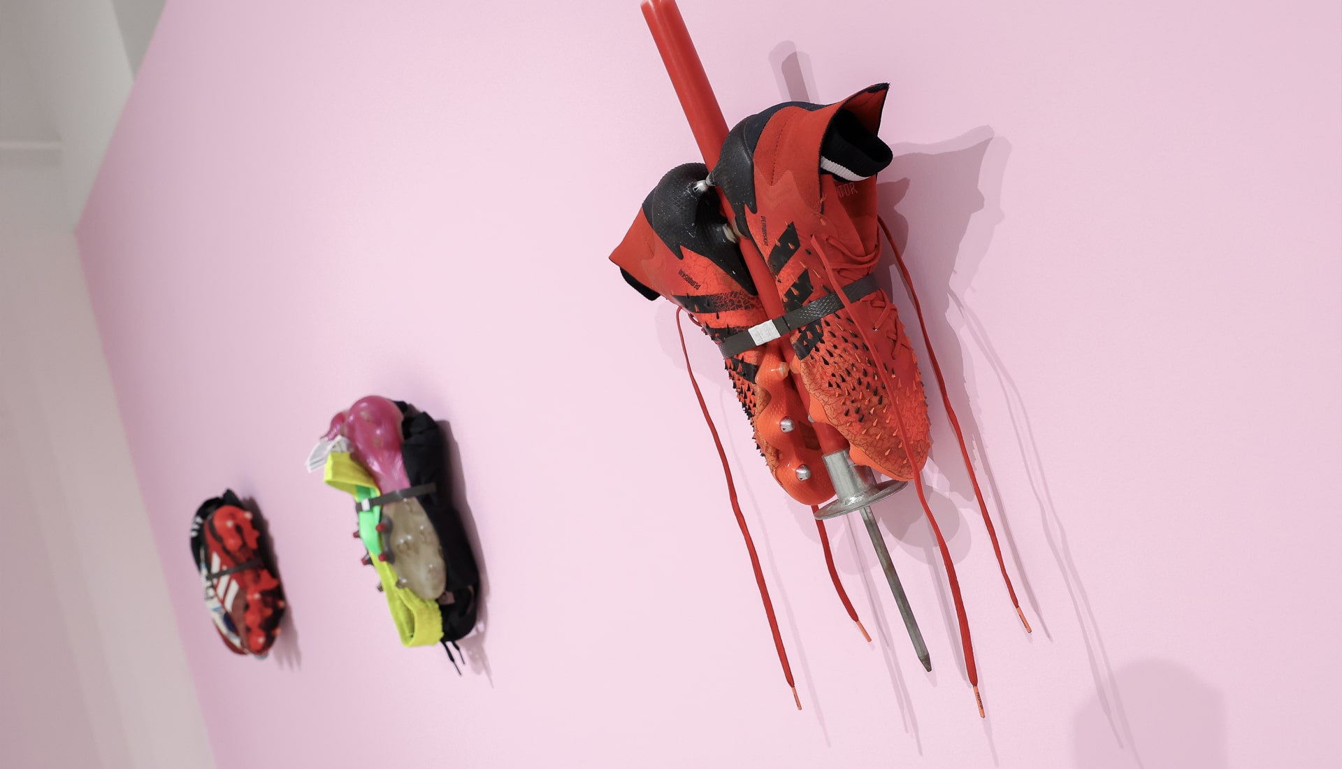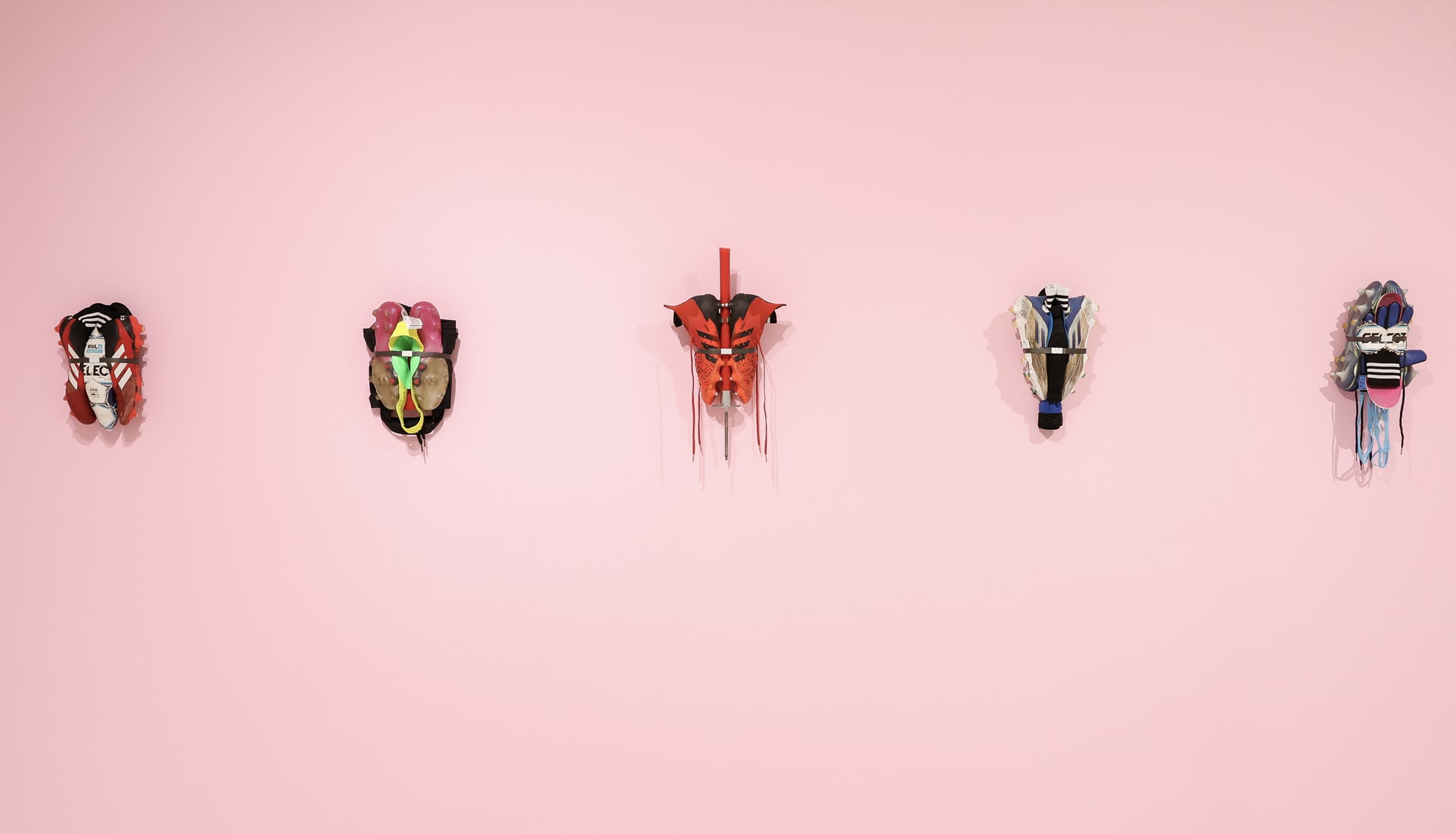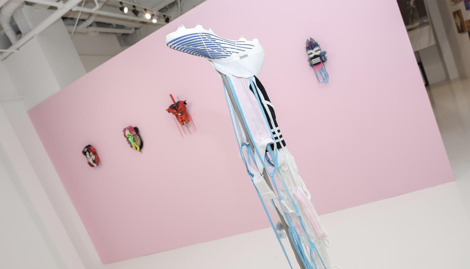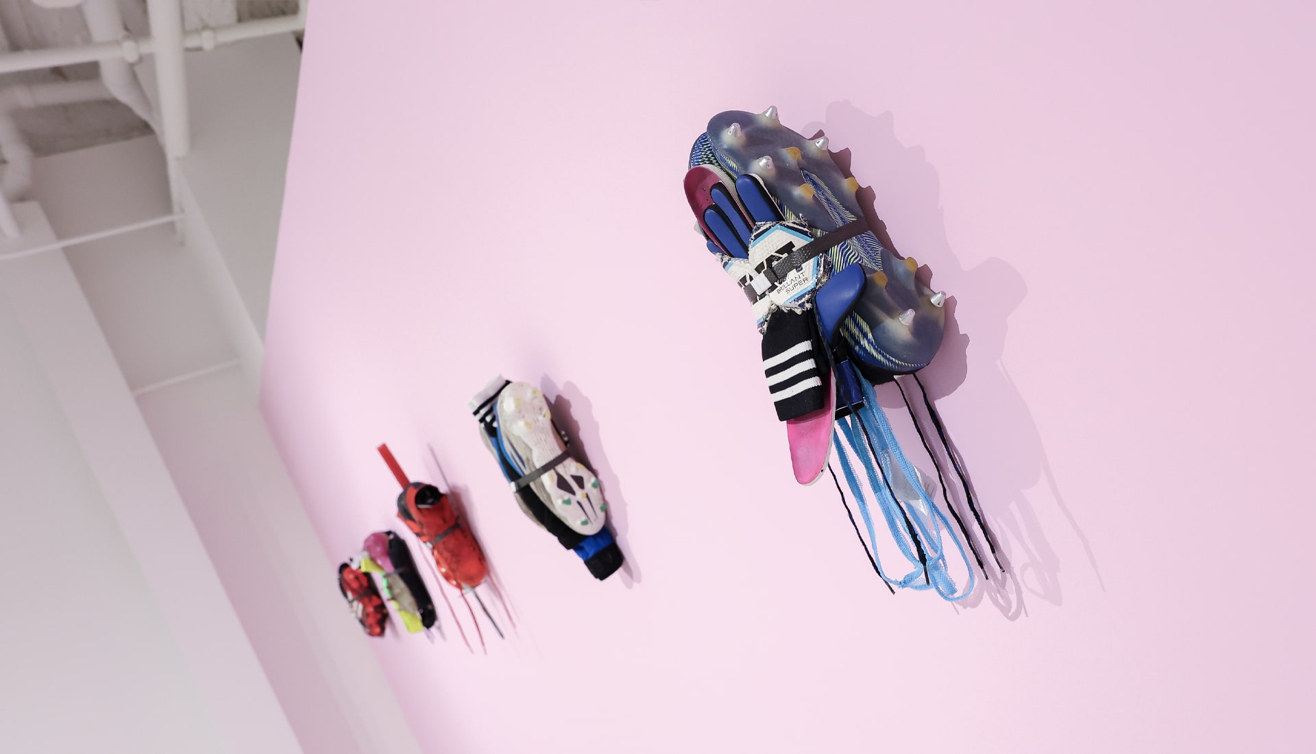 Created by artist Carlos Herrera, whose practice focuses on the assembly of found objects, disused textiles and organic materials, the exhibition is a visual spectacle that offers a fresh perspective on the beauty of football product to fans and art enthusiasts alike. All products used have been sourced by (re)boot directly from Inter Miami, building from their recent up cycled clothing collection with the MLS side.