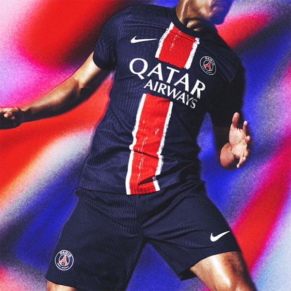 The away jersey rolls things back to the mid-80s, with a white and blue polo collar design inspired by the club’s 1985/86 season away shirt. It’s predominantly white, accented with blue and black. The most eye-catching feature is the blue band across the chest, while a black graphic plays out down the sleeves. A very Lazio-esque feel to this one.