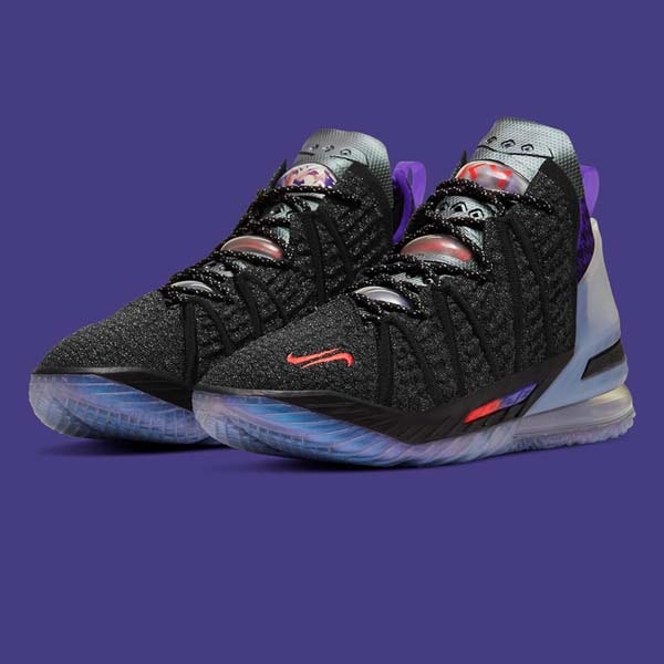 Bringing together the best from two worlds, Nike are set to drop a special Kylian Mbappé edition of the LeBron 18 — NBA Champion LeBron James' current signature shoe. The colourway combines a greyscale upper with pops of purple, blue, and red and features "KM" branding stamped on the tongue, two mini-Swoosh logos embroidered on the toe, as well as an iridescent heel counter and outsole.